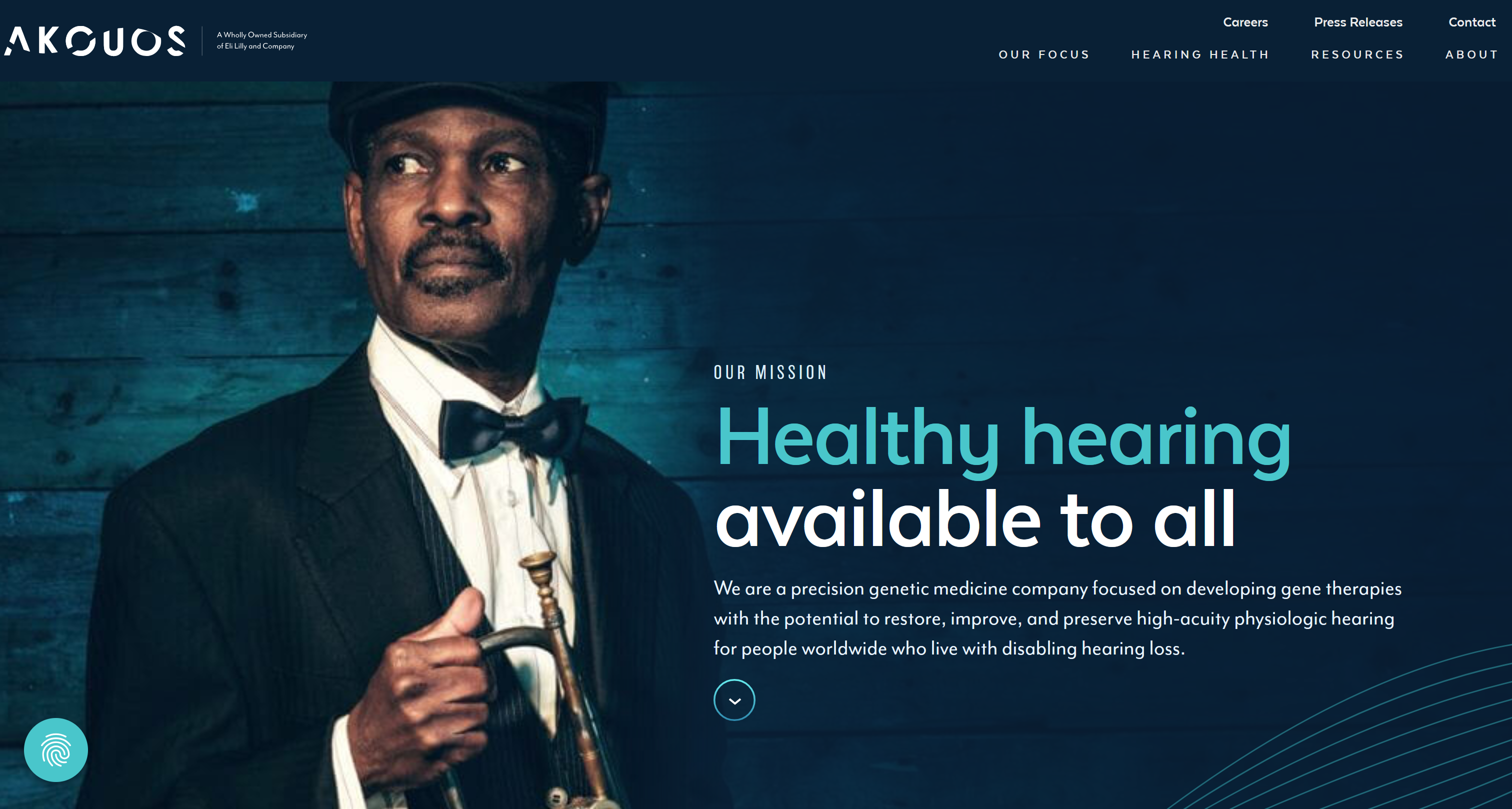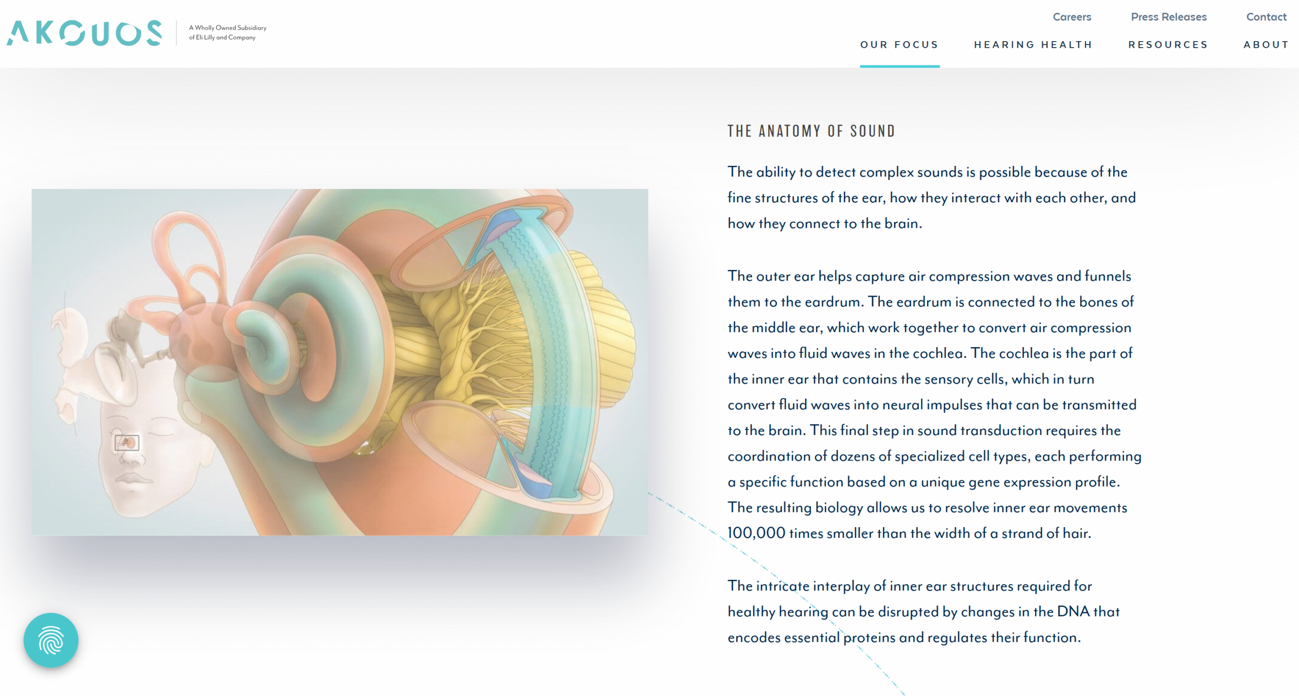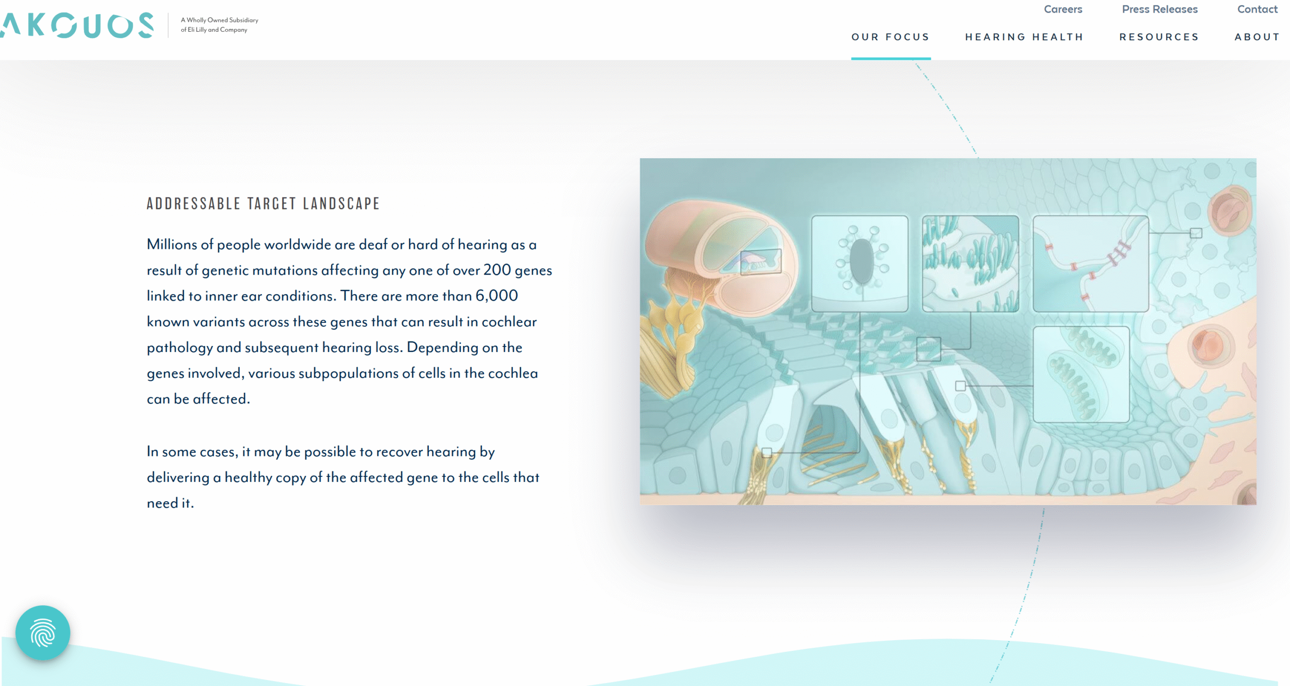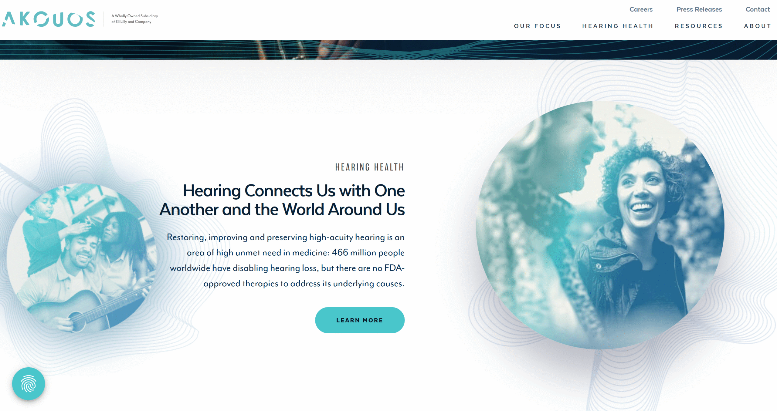 Akouos is working to restore hearing with promising gene therapies. While completing the arduous process of testing and FDA approvals, I was lead program manager on their account tasked to deliver the web experience and define customer segments. This process was complex involving research, competitive analysis, brand workshops across the organization, and forecasting product reception and impact before launch.